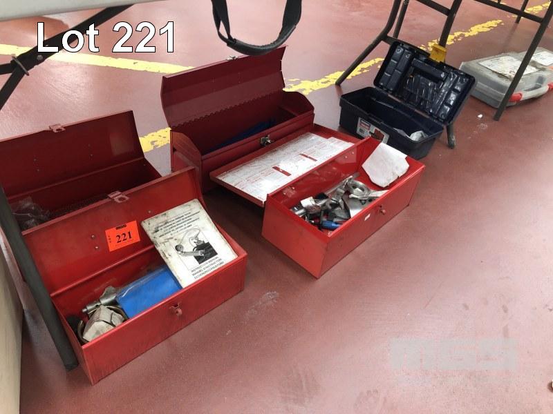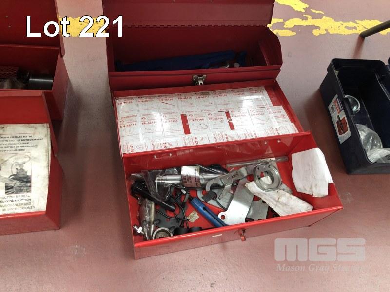 5 x TOOL BOXES & CONTENTS ASSORTED SPECIAL AUTO TOOLS INC PRESSURE TEST KIT, ALIGNMENT TOOLS, BRACKETS, ETC (UNDER TABLE)