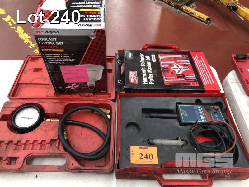 SURE TEST BRAKE FLUID TEST, COMPRESSION GAUGE, HARMONIC BALANCE PULLER & REPCO COOLANT FUNNEL SET