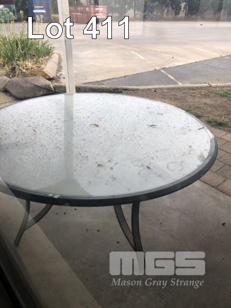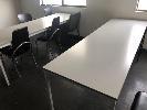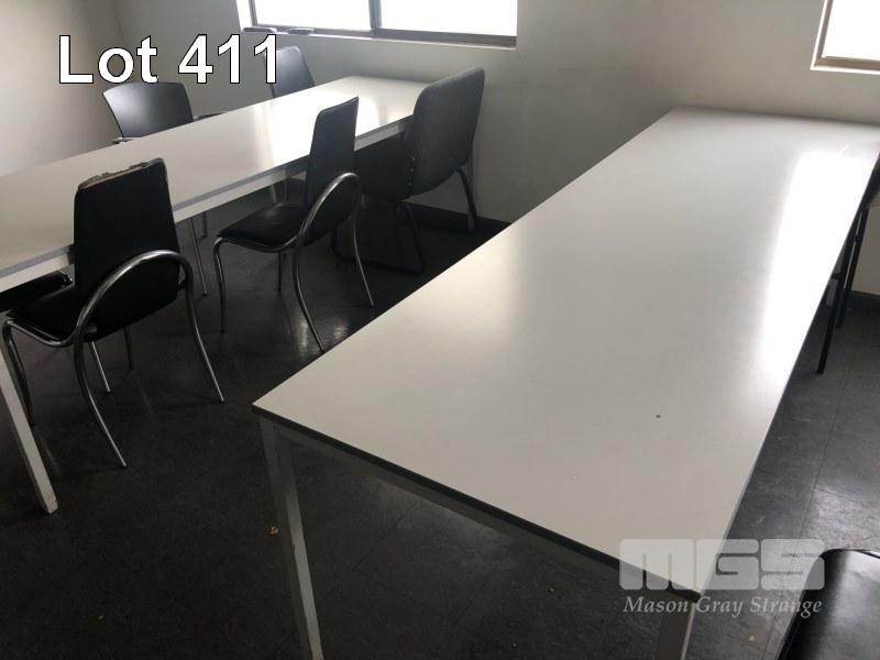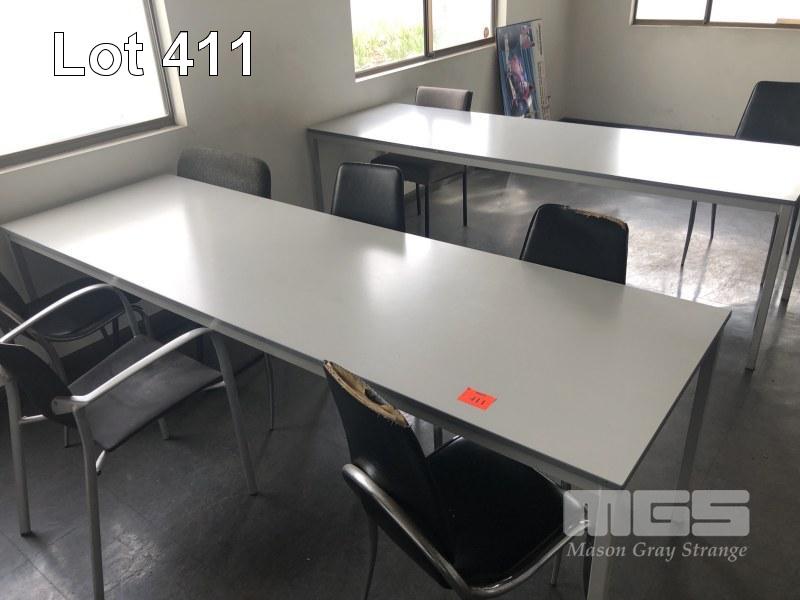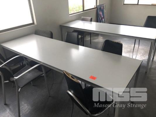 2 x 2400mm MEETING TABLES & ASSORTED CHAIRS, GREY LAMINATE & PATIO TABLE OUTSIDE