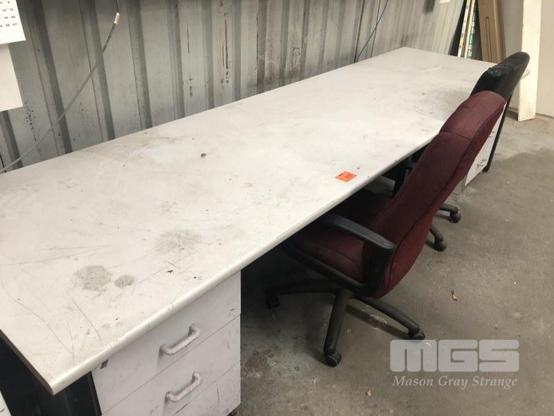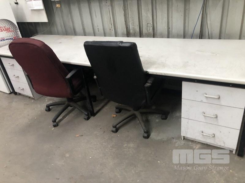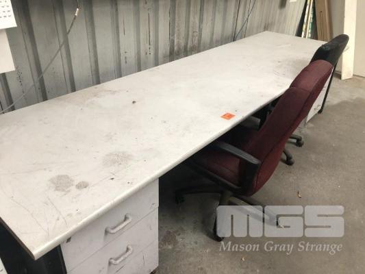 LARGE WORKSHOP DESK STEEL FRAME, GREY LAMINATE TOP 2 x 3 DOOR UNITS & 2 x OFFICE CHAIRS