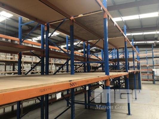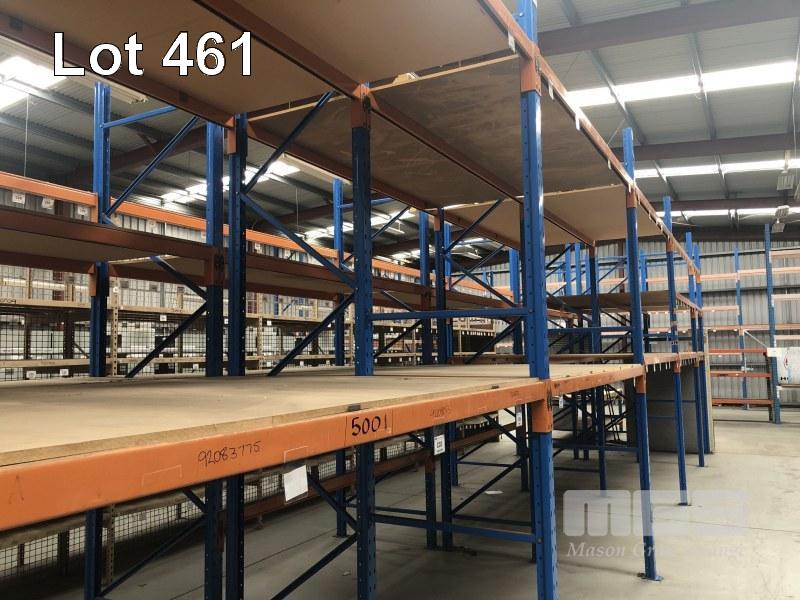 5 BAYS DEXION PALLET RACKING, 1800mm (W) 6 x UPRIGHTS, 3.66m APPROX 24 x CROSS BEAMS, 2.8m APPROX 6 x CROSS BEAMS, 1.45m APPROX WITH CHIPBOARD COVER SHEETS