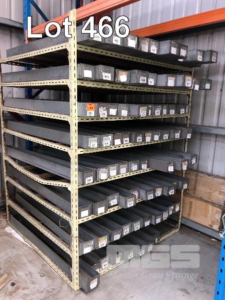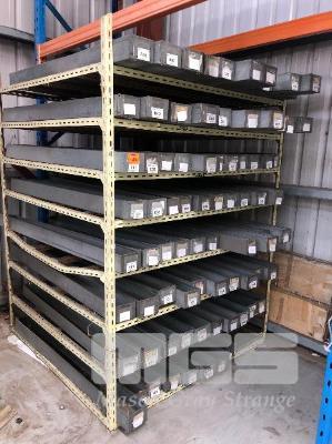 SLOTTED ANGLE PARTS RACK, 8 TIER 1.65 x 1.55 x 2.2m (H) WITH APPROX 75 x GALV METAL TRAYS
