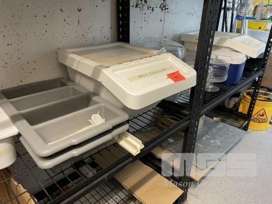 4 x CAKE DISPLAYS, 2 X FLOUR TUBS, 2 x CUTLERY TRAYS & SMALL ESKY
