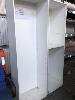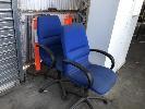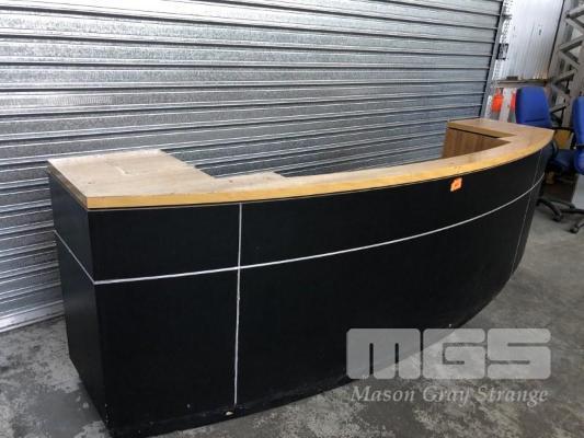 TIMBER RECEPTION COUNTER 3m LONG CUPBOARD AND DRAWERS CURVED FRONT 2 BLUE CLOTH OFFICE CHAIRS. 2 x WHITE LAMINEX TIMBER SHELF UNITS 2300mm x 600mm x 600mm