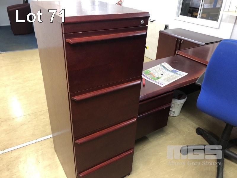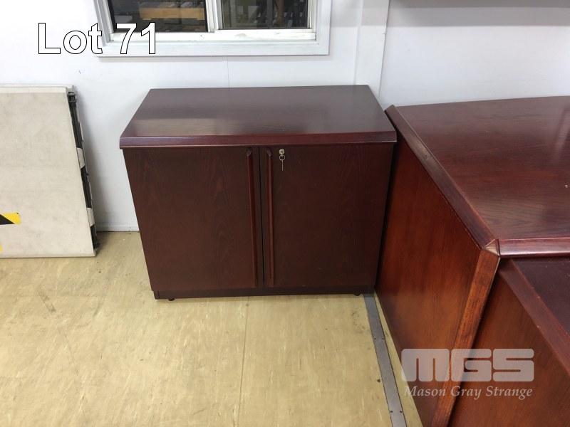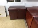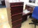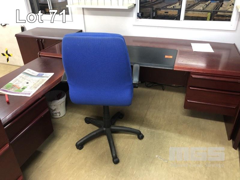 DESK, DARK ROSEWOOD LOOK TIMBER, 3 DRAWER & 2 DRAWER RETURN, VINYL INLAY DESK, 2100 x 900mm WITH 1200m RETURN, MATCHING LOWLINE 2 DOOR CUPBOARD, 900 x 500mm, 4 DRAWER FILING CABINET & BLUE/BLACK CLOTH GAS LIFT OFFICE CHAIR