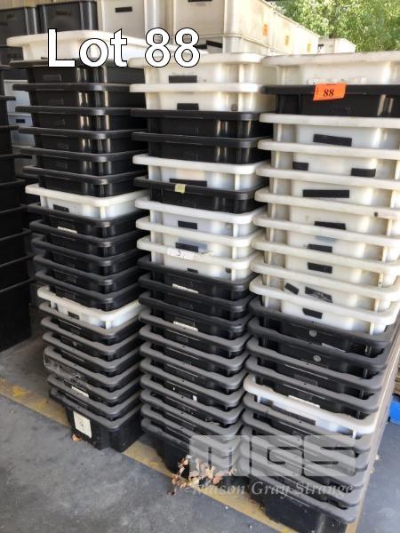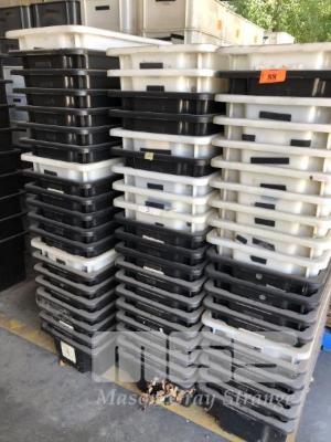 60 x PLASTIC STORAGE TUBS, 600 x 400 x 200mm APPROX BLACK & WHITE, STACKABLE