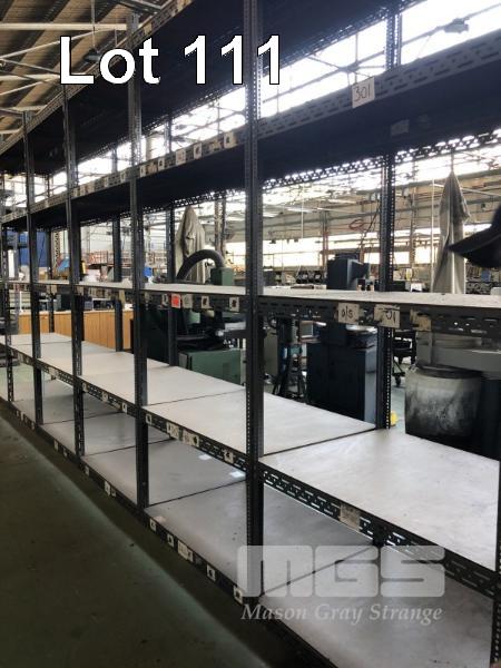 3 x SLOTTED ANGLE SHELF UNITS, 3200 (H) x 1230 (W) x 930mm (D) 5 TIER WITH MASONITE SHELVES HEAVY DUTY