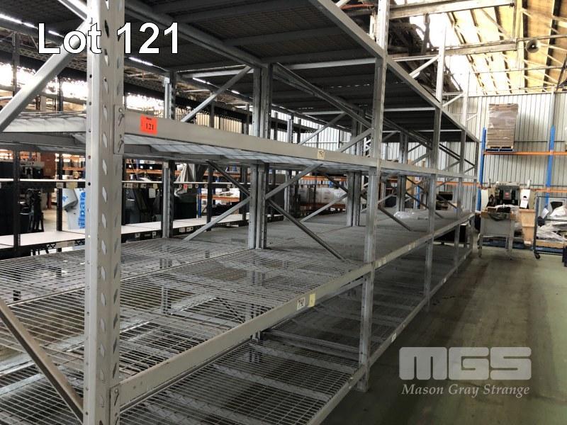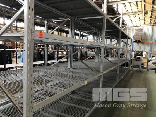 1 ROW COLBY PALLET & STORAGE RACKING, 4 BAYS 5 x , 3680mm UPRIGHTS 32 x CROSSBEAMS, 2600mm RACK: 1160mm (D) WITH 100 x 40mm MESH PANELS TO EACH SHELF PALLETS ON BOXES