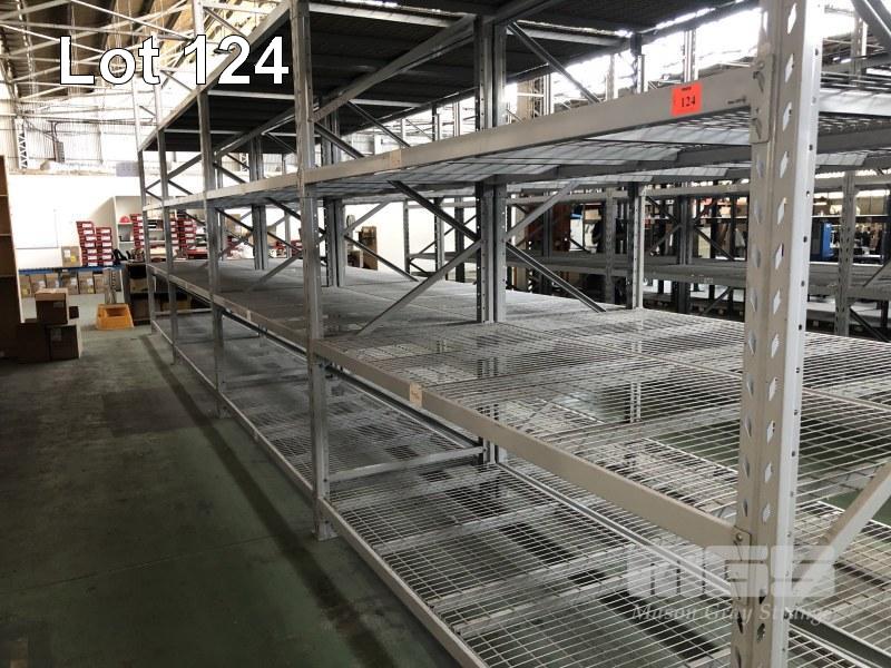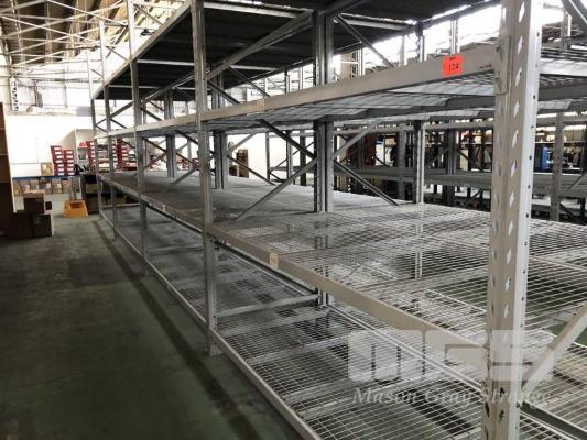 1 ROW COLBY PALLET & STORAGE RACKING, 4 BAYS 5 x , 3680mm UPRIGHTS 32 x CROSSBEAMS, 2600mm RACK: 1160mm (D) WITH 100 x 40mm MESH PANELS TO EACH SHELF PALLETS ON BOXES