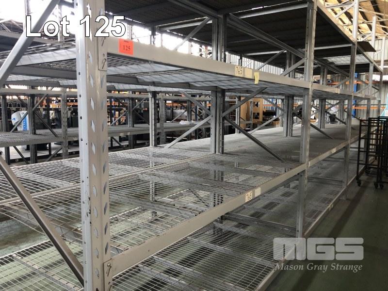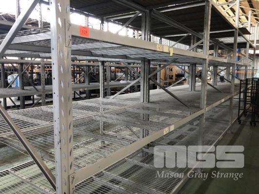 1 ROW COLBY PALLET & STORAGE RACKING, 4 BAYS 5 x , 3680mm UPRIGHTS 32 x CROSSBEAMS, 2600mm RACK: 1160mm (D) WITH 100 x 40mm MESH PANELS TO EACH SHELF PALLETS ON BOXES