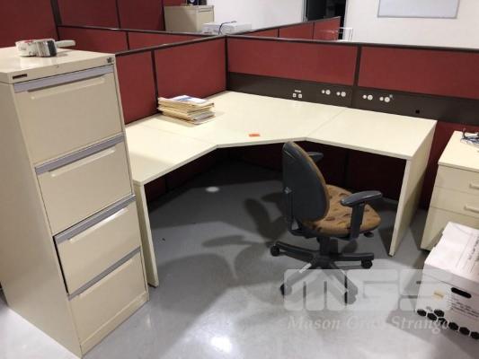 CREAM LAMINATE DESK AND RETURN 1800 x 1800mm WITH 3 DRAWER UNDER DESK MOBILE AND GAS LIFT OFFICE CHAIR WITH BROWN BUILT 4 DRAWER STEEL FILING CABINET, CREAM