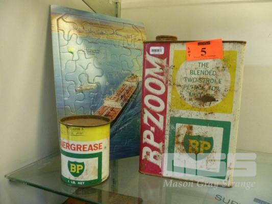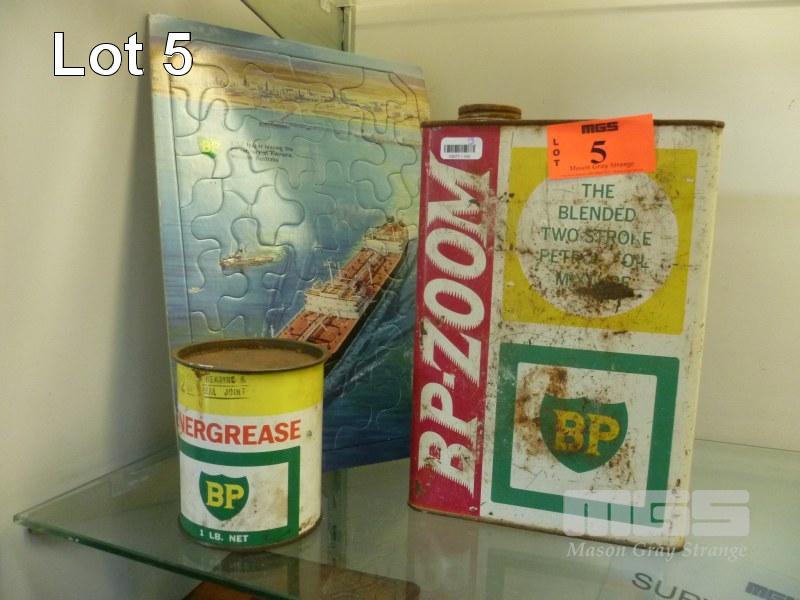 3 x BP PETROL/OIL PRODUCTS IN ONE POUND GREASE TIN, 1 GALLON TIN & VINTAGE COMPLETE JIGSAW PUZZLE