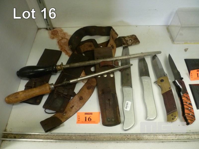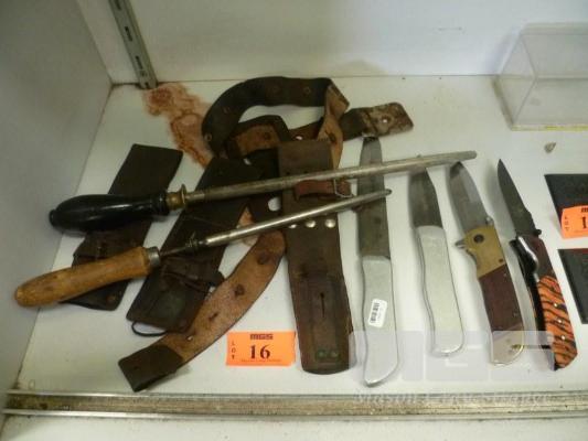 2 X BUTCHERS STEELS, BROWNING & BUCK POCKET KNIVES, 2 X ALUMINIUM HANDLED KNIVES & LEATHER HOLDERS