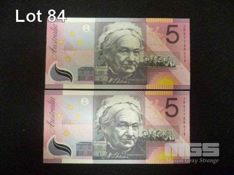2001 2 x 5 DOLLAR FEDERATION LAST PREFIX JD01 CONSECUTIVE NOTES