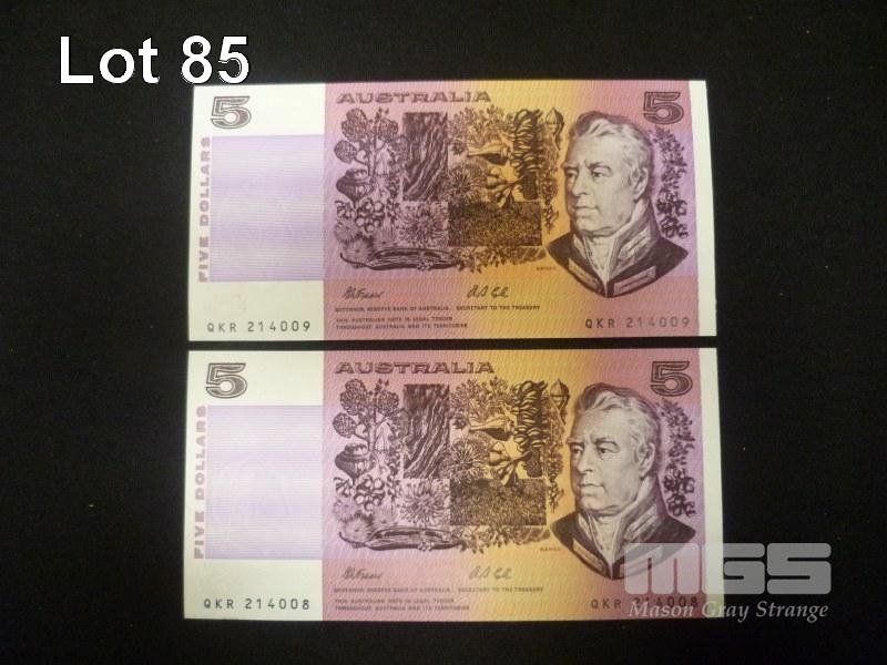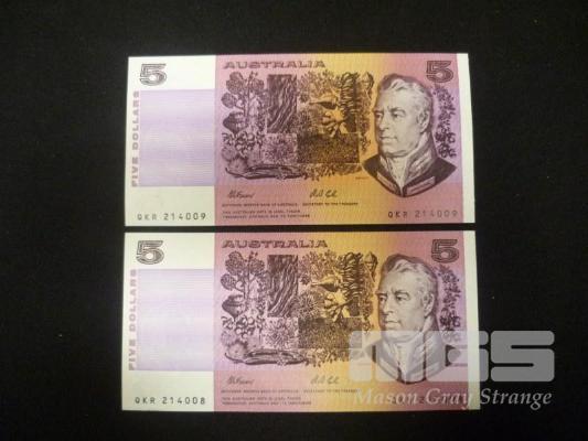 1991 2 x 5 DOLLAR CONSECUTIVE NOTES LAST OF THE PAPER $5 UNC