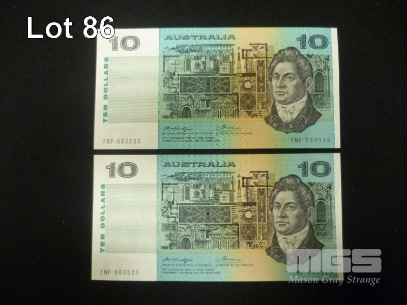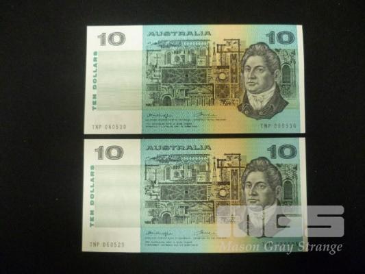 1976 2 x 10 DOLLAR NOTES CONSEC "SIDE THREAD" KNIGHTS WHEELER UNC