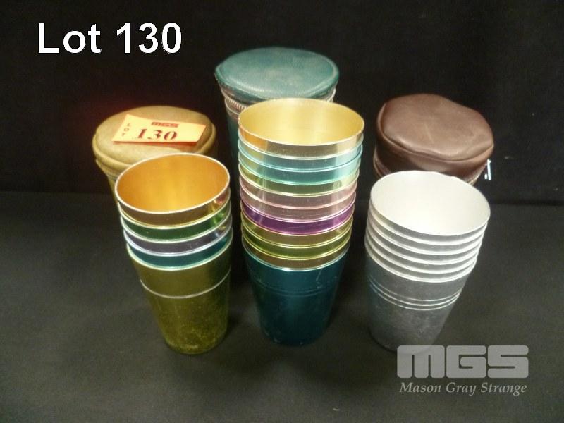 VINTAGE ANODIZED CUP SETS IN LEATHER BOUND CASES