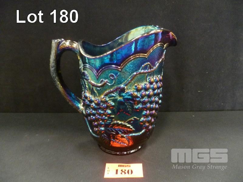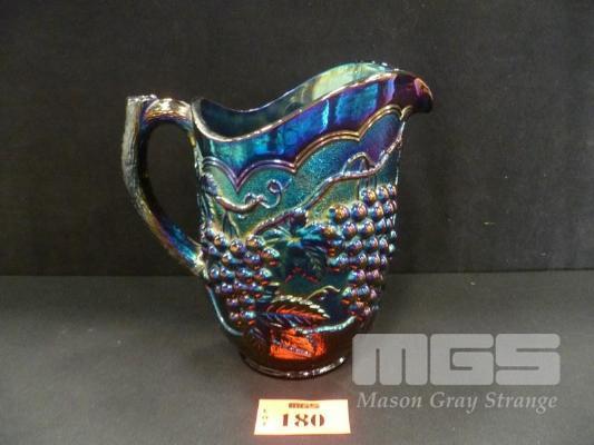 AMETHYST CARNIVAL GLASS JUG, GRAPE EMBOSSED