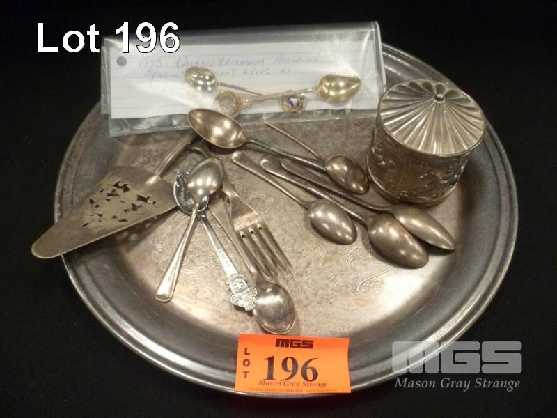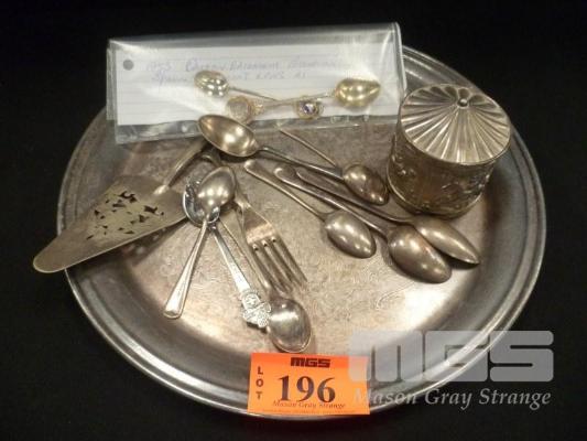 EPNS COLLECTION, SERVING TRAY, ROLEX TEASPOON, PARAMOUNT SILVER CAKE SERVER "MAYFLOWER", CORONATION TEASPOON, PEWTER MONEY BOX ETC