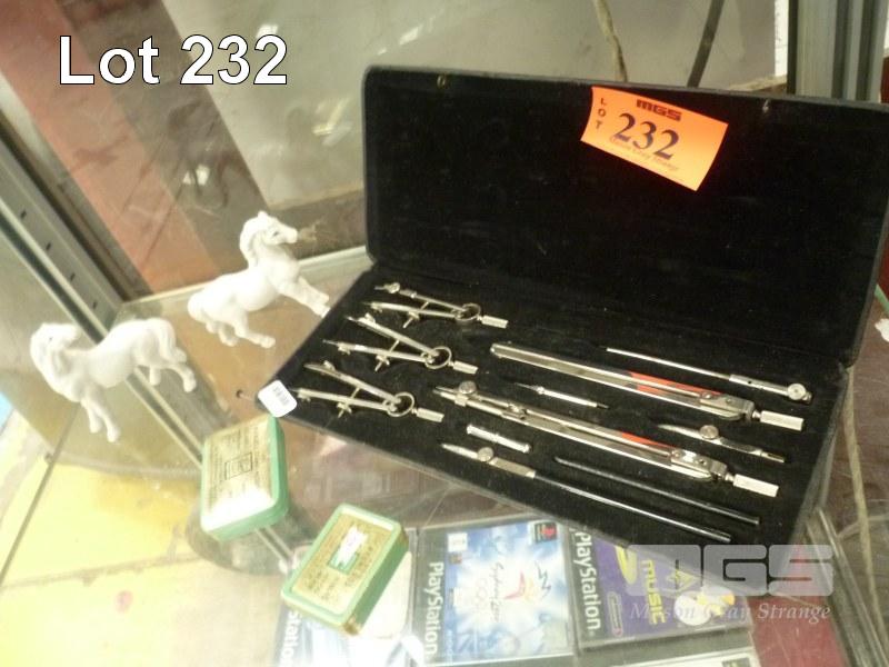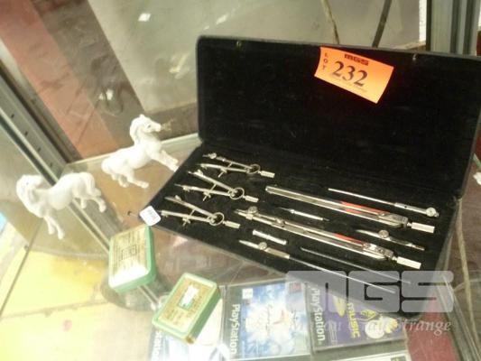 COLLECTION VINTAGE DRAFTSMAN SET IN ORIGINAL CASE, VINTAGE ENGLISH TINS & 2 x PORCELAIN MINIATURE HORSES