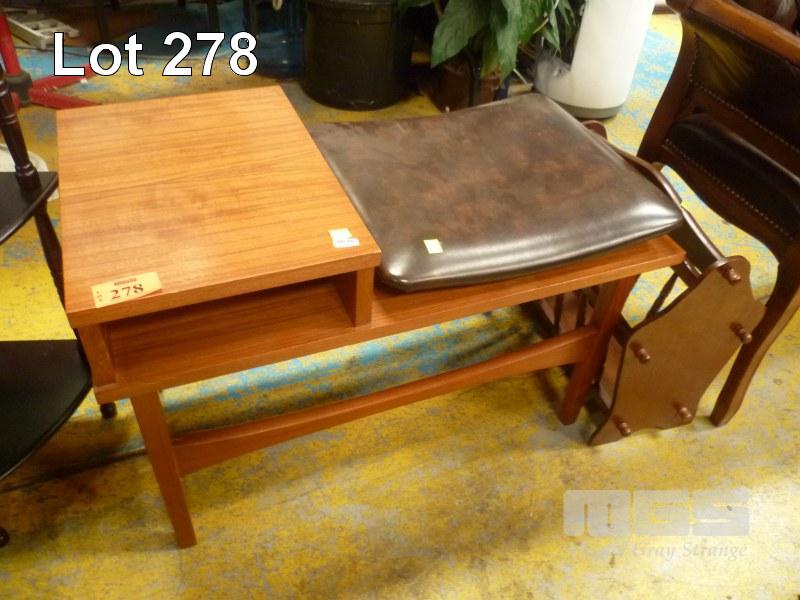 TIMBER TELEPHONE TABLE, BROWN LEATHER UPHOLSTERED WITH TIMBER MAGAZINE RACK