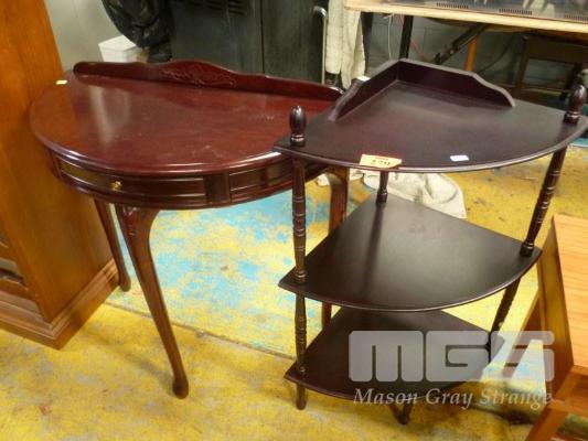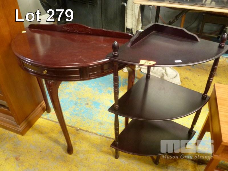 CORNER 3 TIER WHATNOT & MAHOGANY HALF ROUND HALL TABLE