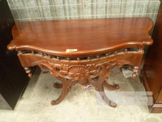 MAHOGANY DECORATIVE CARVED HALL TABLE ON SINGLE PEDESTAL BASE