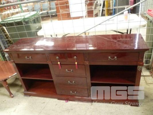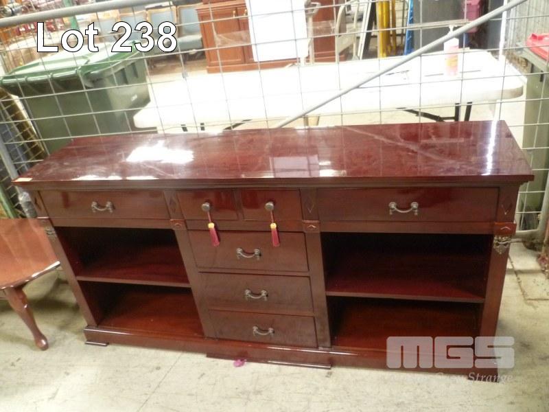WOHLERS MAHOGANY HIGH GLOSS DINING ROOM BUFFET UNIT, 7 DRAWER WITH SIDE SHELF COMPARTMENT, BRASS HANDLES & FEATURES