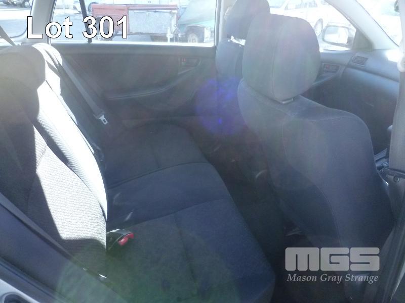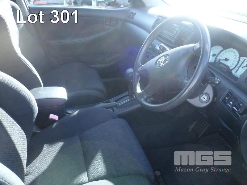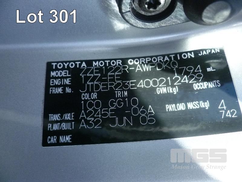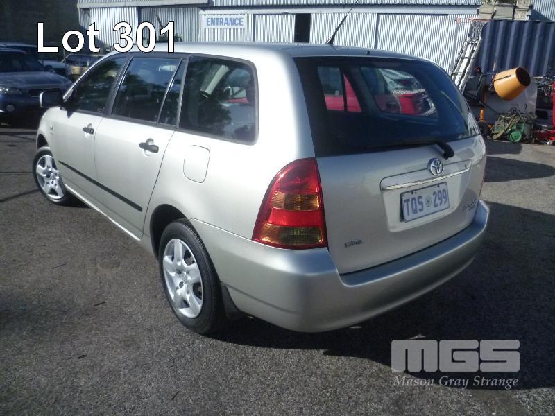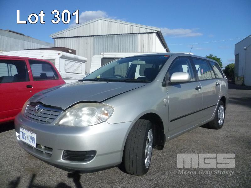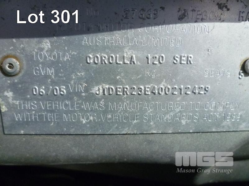 2005 COROLLA ASCENT WAGON REG: TAS-299 (SA) VIN: JTDER23E400212429 ENG: 1ZZ-FE ODO: 78,764 KM 1.8 LITRE, 3 SPEED AUTOMATIC, PETROL, SILVER, 5 DOORS, 5 SEAT, AIR BAG, AIR CON, CD PLAYER, CENTRAL LOCKING, IMMOBILISER, POWER STEERING, SPARE WHEEL (NO PAPERS, NO OWNER'S MANUAL, NO SERVICE BOOKS)