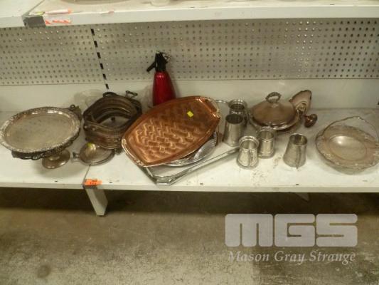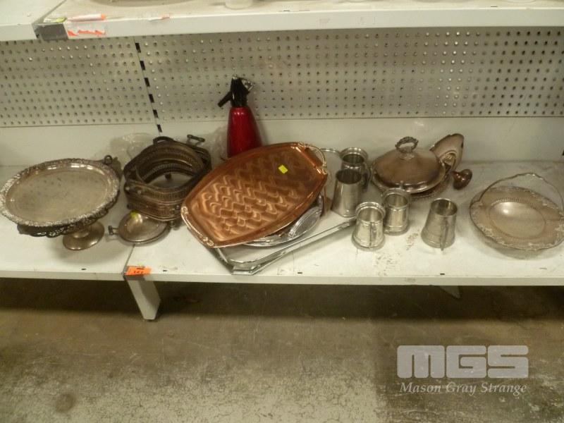 PEWTER MUGS, EPNS, SERVING TRAYS ETC, 1 X SHELF