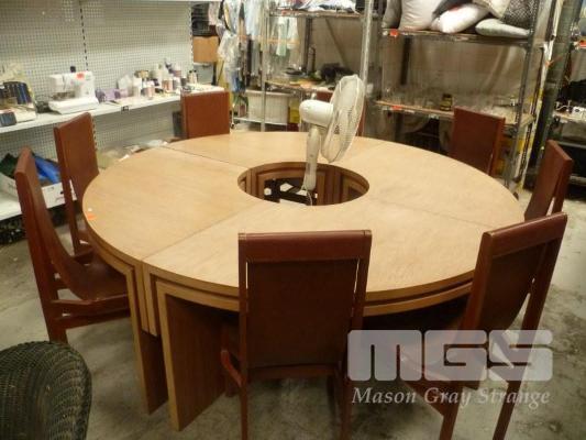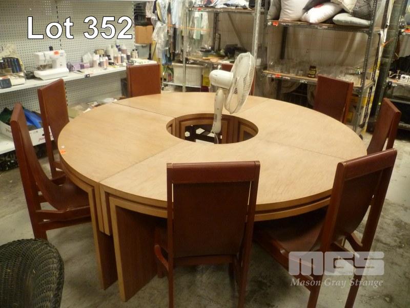 TIMBER VENEER 4 PIECE MODULAR ROUND BOARDROOM TABLE WITH SET 8 TIMBER FRAME,LEATHER STRAP CHAIRS