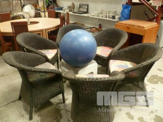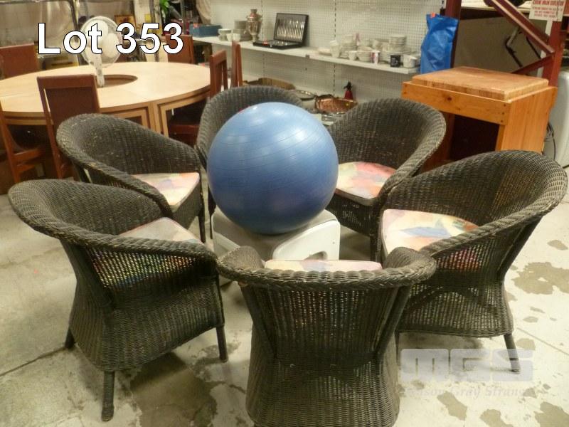 SET 6 BLACK WICKER ARM CHAIRS, FOOT STOOL & EXERCISE BALL