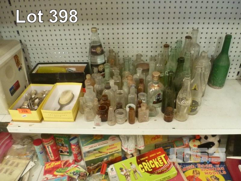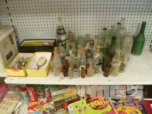 ASSORTED VINTAGE BOTTLES, SOUVENOR SPOONS, ETC