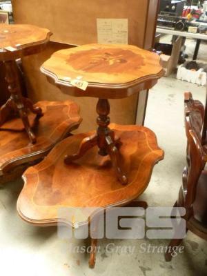 MAHOGANY WINE TABLE & OCCASIONAL TABLE, SILKWOOD MARQUETRY INLAY, SINGLE PEDESTAL, DECORATIVE CARVED LEGS, (MINOR HEAT MARKS)
