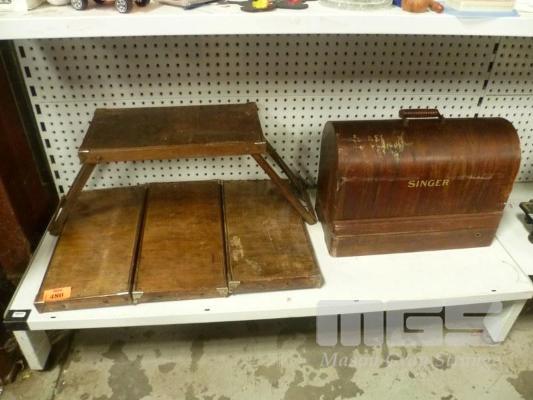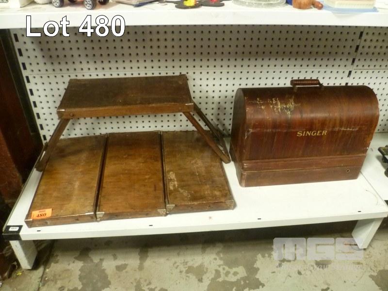 SET 4 VINTAGE TIMBER CAMP STOOLS & SINGER SEWING MACHINE (NO KEY)