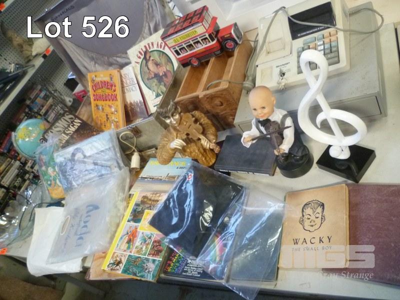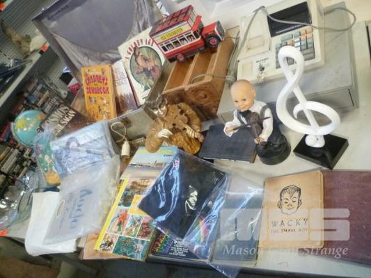 SUITCASE, TINS, CASH REGISTER, VINTAGE PUZZLES, BOOKS, GLOBE, ETC, 1 x TABLE