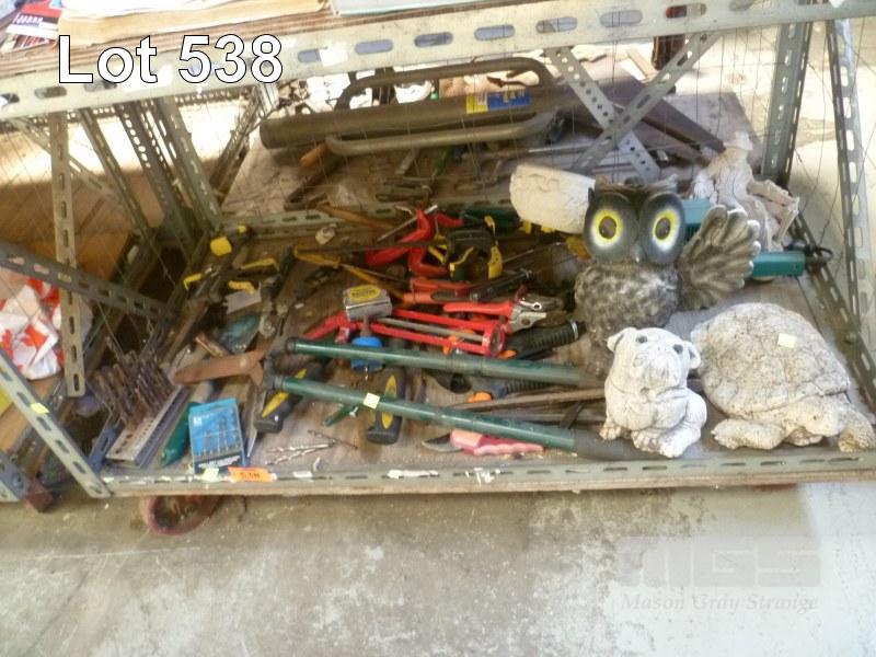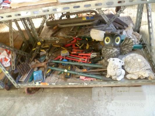 ASSORTED GARDEN TOOLS, TOOLS, & GARDEN STATUES