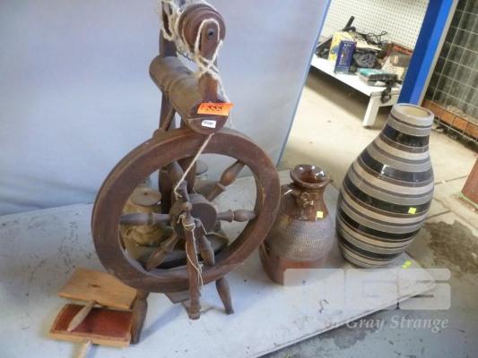 TIMBER, WOOL SPINNING WHEEL & 2 X GLAZED FLOOR VASES