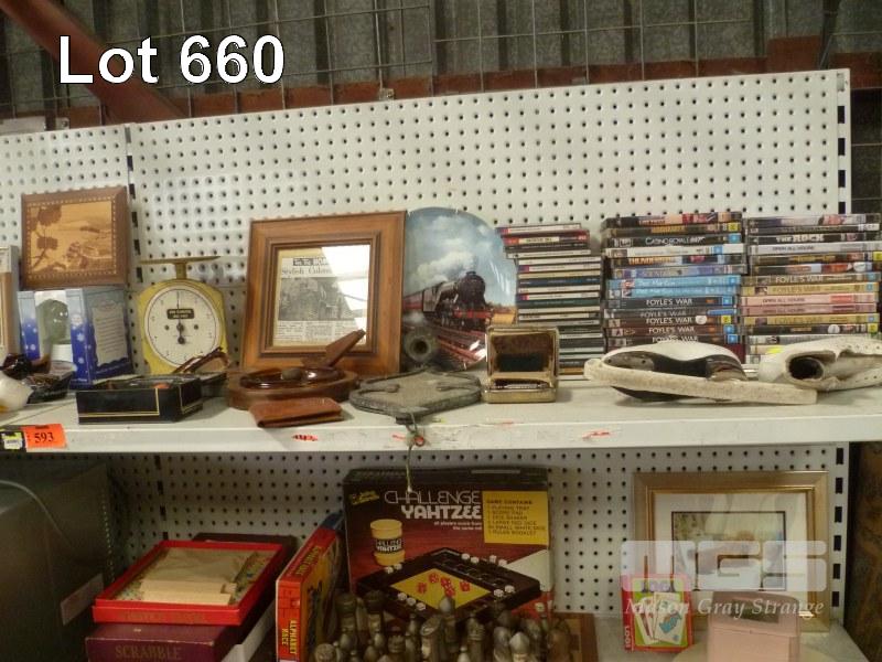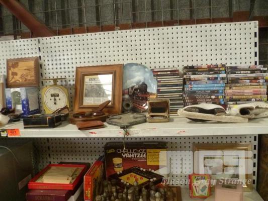 ASSORTED BOARD GAMES, DVD'S, CD'S, CHILDRENS ICE SKATES, SCALES, ETC, 2 x SHELVES
