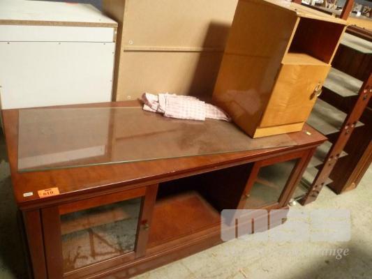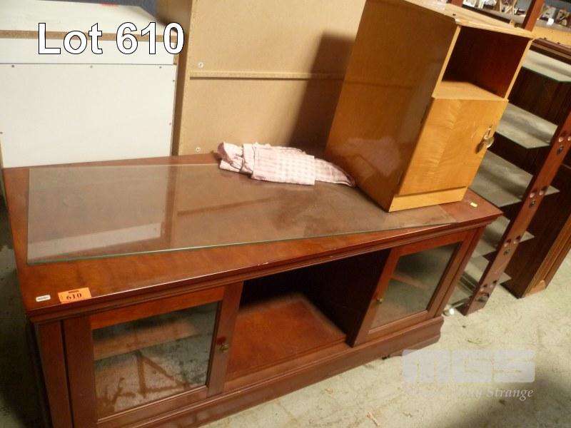 TIMBER VENEER LOWLINE ENTERTAINMENT UNIT, GLAZED DOORS WITH SHELF UNIT, 5 X GLASS SHELVES (18575-79)