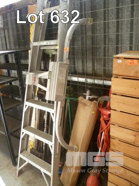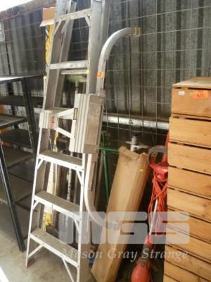 ELECTRIC LUMBERACK PRUNER, FLYMO ELECTIRC LINE TRIMMER, ALUMINIUM LADDER & GARDEN TOOLS & SHELVES