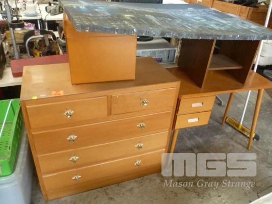 CHILDRENS DESK, SIDE TABLE, 5 DRAWER CHEST & SQUARE VINYL OTTOMAN (18778-13)
