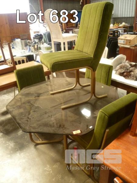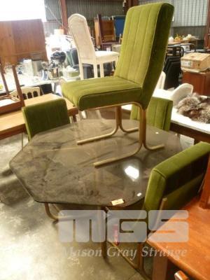 5 PIECE DINING SUITE INC METAL FRAME, GLASS TOP OCTAGONAL TABLE & 4 x GREEN VELVET CHAIRS