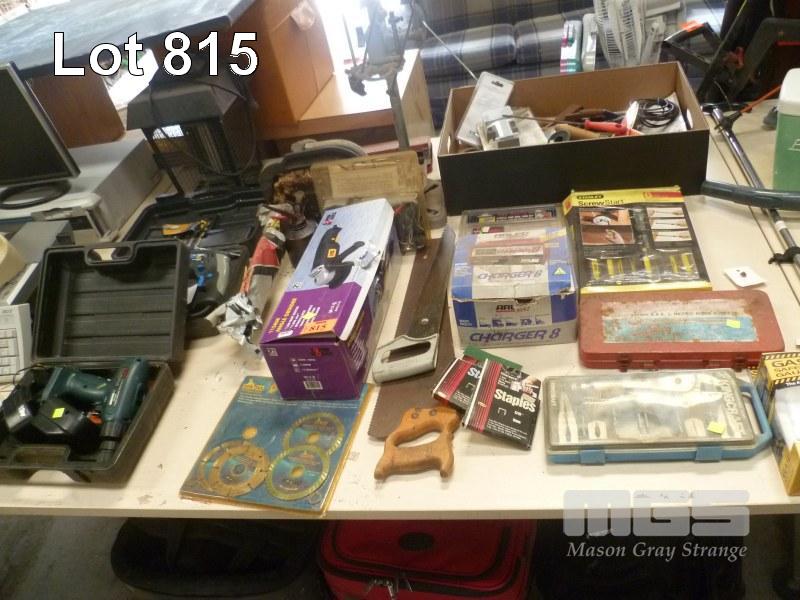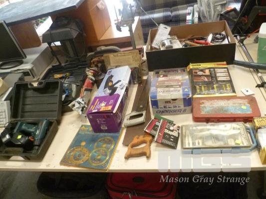 ASSORTED TOOLS INC WORKS ANGLE GRINDER, RYOBI CORDLESS DRILL, POWERMASTER HAMMER DRILL & ASSORTED HAND TOOLS, 1 x TABLE