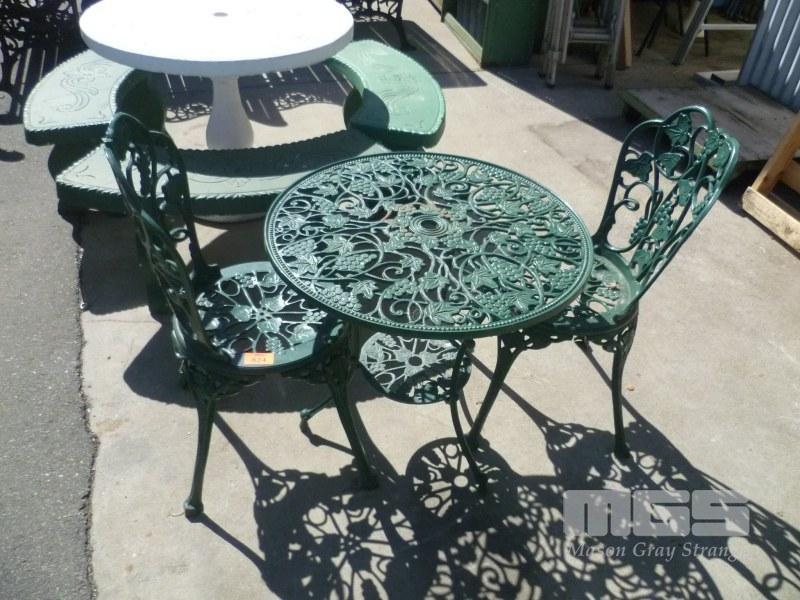 GREEN, CAST ALUMINIUM 3 PIECE OUTDOOR SETTING, INC; ROUND TABLE & 2 CHAIRS