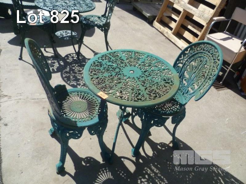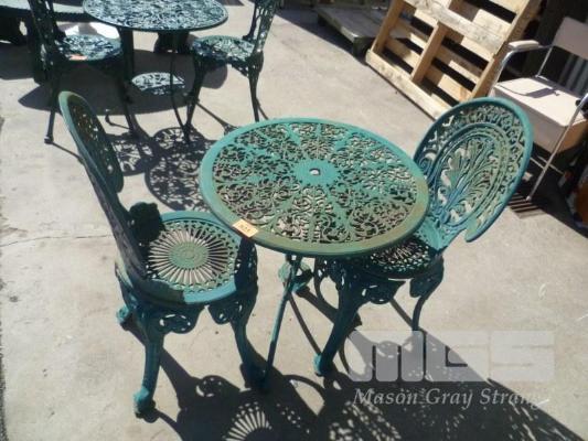 CAST IRON, 3 PIECE OUTDOOR SETTING, INC; ROUND TABLE & 2 X CHAIRS