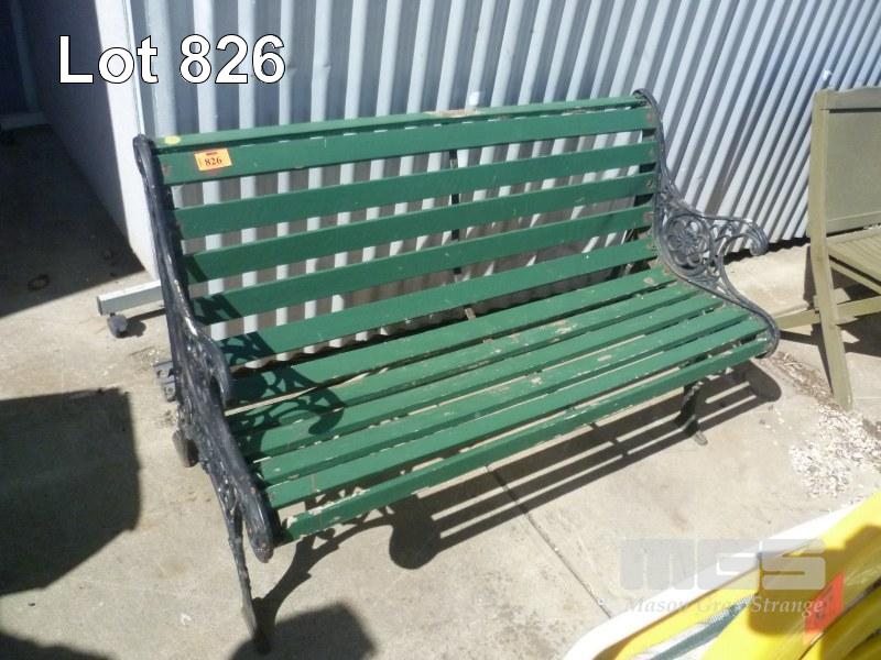 OUTDOOR BENCH, BLACK CAST IRON ENDS, GREEN TIMBER SLAT