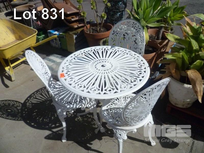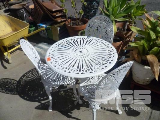 WHITE PAINTED ALUMINIUM 4 PIECE OUTDOOR SETTING INC ROUND TABLE & 3 x CHAIRS