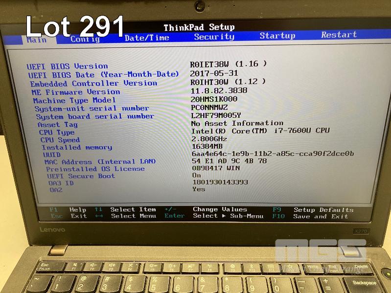 LAPTOP, LENOVO THINKPAD X270 (20HMS1K000), CORE i7 7600U (7TH GEN) @ 2.8GHz, 16GB DDR4 RAM, 256GB NVMe M.2 SSD, 12.5" WIDESCREEN (1366x768), INTEL HD VIDEO, Wi-Fi, BLUETOOTH, WINDOWS 10 PRO INSTALLED & POWER SUPPLY (NOTE: MINOR DAMAGE TO CASING) S/N:PC0NNMWZ