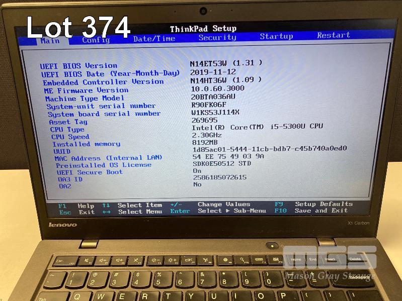 LAPTOP, LENOVO THINKPAD X1 CARBON (20BTA036AU), CORE i5 5300U (5TH GEN) @ 2.3GHz, 8GB DDR3 RAM, 256GB M.2 SSD, 14" WIDESCREEN (1920x1080), INTEL HD VIDEO, Wi-Fi, BLUETOOTH, WINDOWS 10 HOME INSTALLED & POWER SUPPLY S/N:R90FK06F